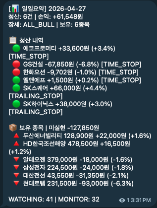 - 🟡 4/24 진입 4종의 D+1~D+5 흐름 모니터링 — 5/2(금) 동시 만기 위험. 그 전에 TRAILING/TARGET으로 일부 청산 분산되는지 관찰.