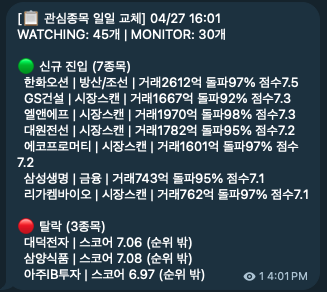 - 섹터 로테이션 시그널: 청산 섹터 = 2차전지(에코프로머티/엘앤에프) + 건설(GS건설) + 조선(한화오션) + 반도체(SK하이닉스/SK스퀘어). 신규 = 바이오(알테오젠). 2차전지·건설·반도체에서 자금이 빠지고 바이오로 이동한 첫 신호. 4/28 이후 다른 바이오 종목 돌파 빈도를 모니터링할 가치 있음.