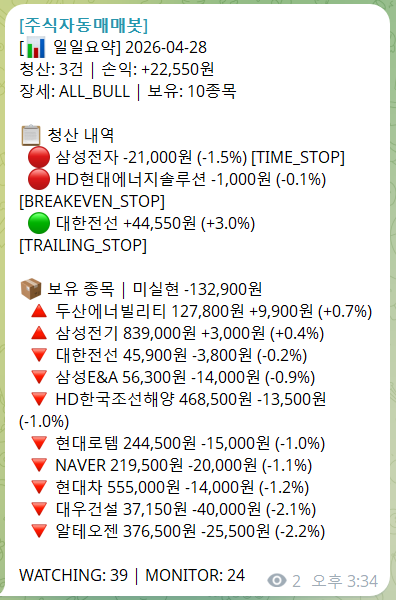 4월 28일 매매 일지 -- 표면 +22,550원, 그 뒤에 가려진 봇 hang과 F5 도입