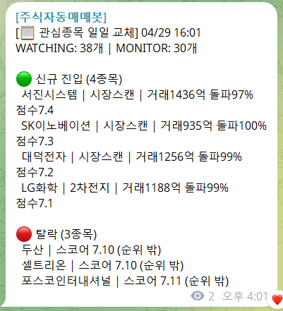 | 4/29 | 현대로템 (064350) | 262,000 | 7 | 0 | 0.55 | 🔁 재매수 |